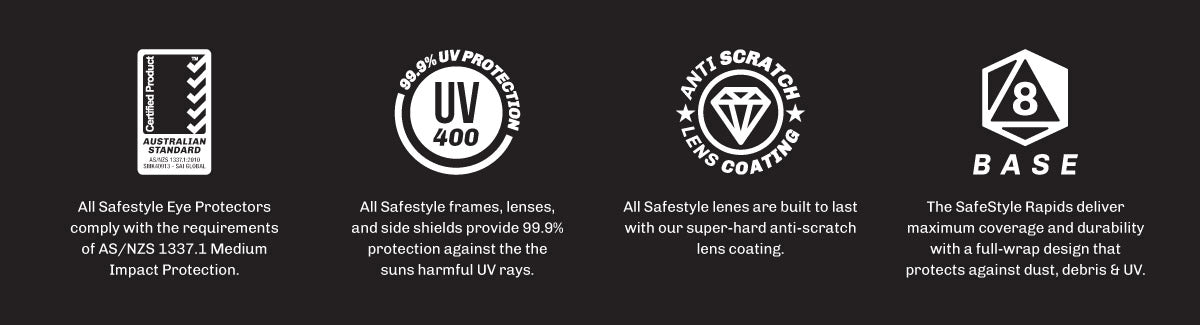 SafeStyle’s tinted lenses are perfect for outdoor use with a dark tint for general use while being productive on the job. Although these are non-polarised they still protect your eyes from the suns harmful rays. All SafeStyle lenses are made from 100% recyclable UV400 shatterproof polycarbonate, blocking 99.9% of UVA/UVB with a super-hard anti-scratch coating.