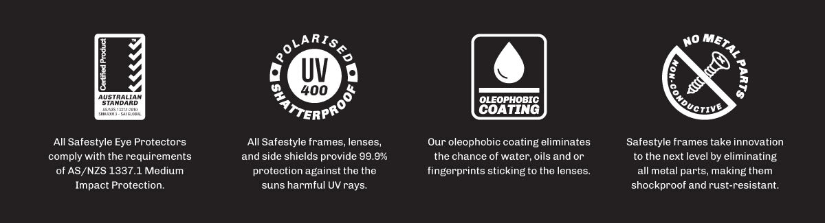 SafeStyle’s polarised lenses are perfect for outdoor use with a dark tint for general use and work by reducing glare from the road, water, snow or any bright light reflective surface. SafeStyles polarised lenses also have an additional oleophobic coating to eliminate any chance of water, oils or fingerprints sticking to the lenses.. a great feature for out on the water! All SafeStyle lenses are made from 100% recyclable UV400 shatterproof polycarbonate, blocking 99.9% of UVA/UVB with a super-hard anti-scratch coating.