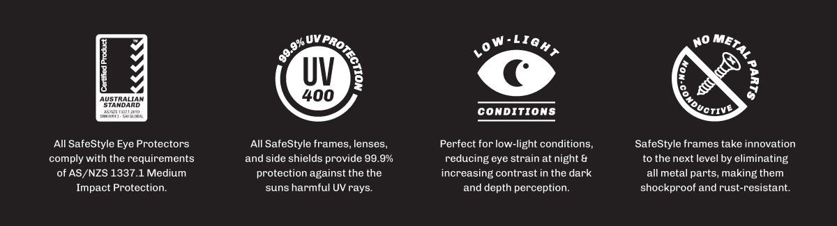 SafeStyle’s yellow lenses are perfect for low-light conditions, reducing eye strain at night & increasing contrast in the dark and depth perception. The ideal lenses for night works, overcast, hazy and foggy conditions. All SafeStyle lenses are made from 100% recyclable UV400 shatterproof polycarbonate, blocking 99.9% of UVA/UVB with a super-hard anti-scratch coating.