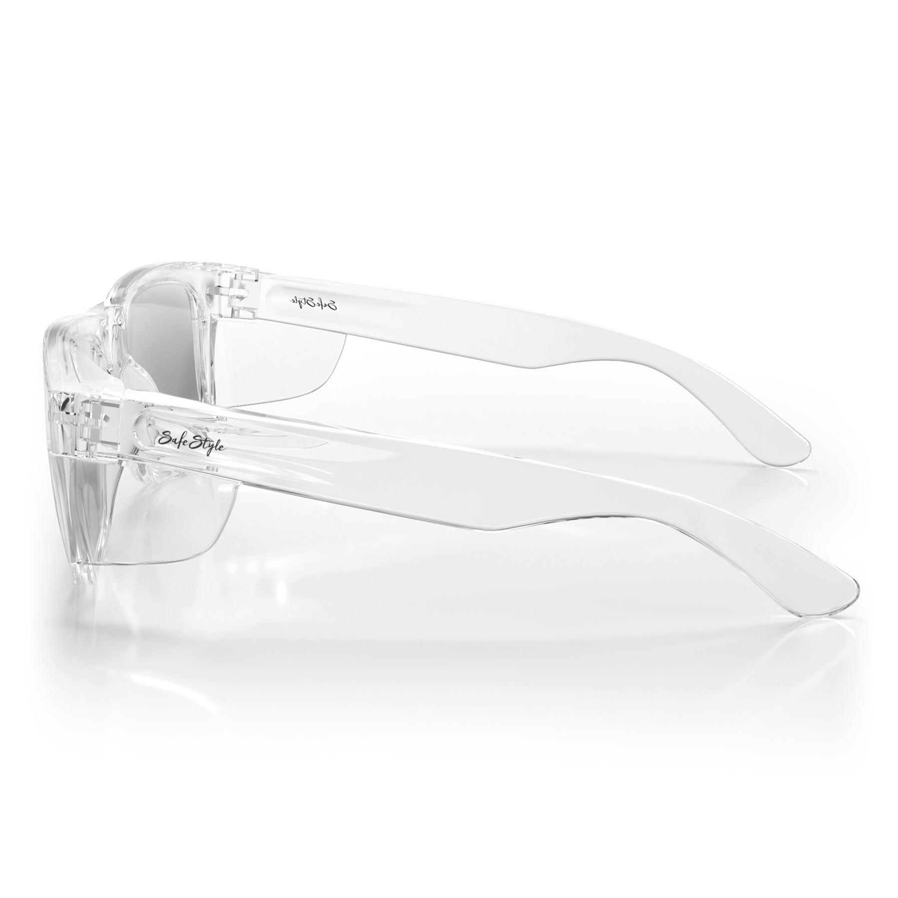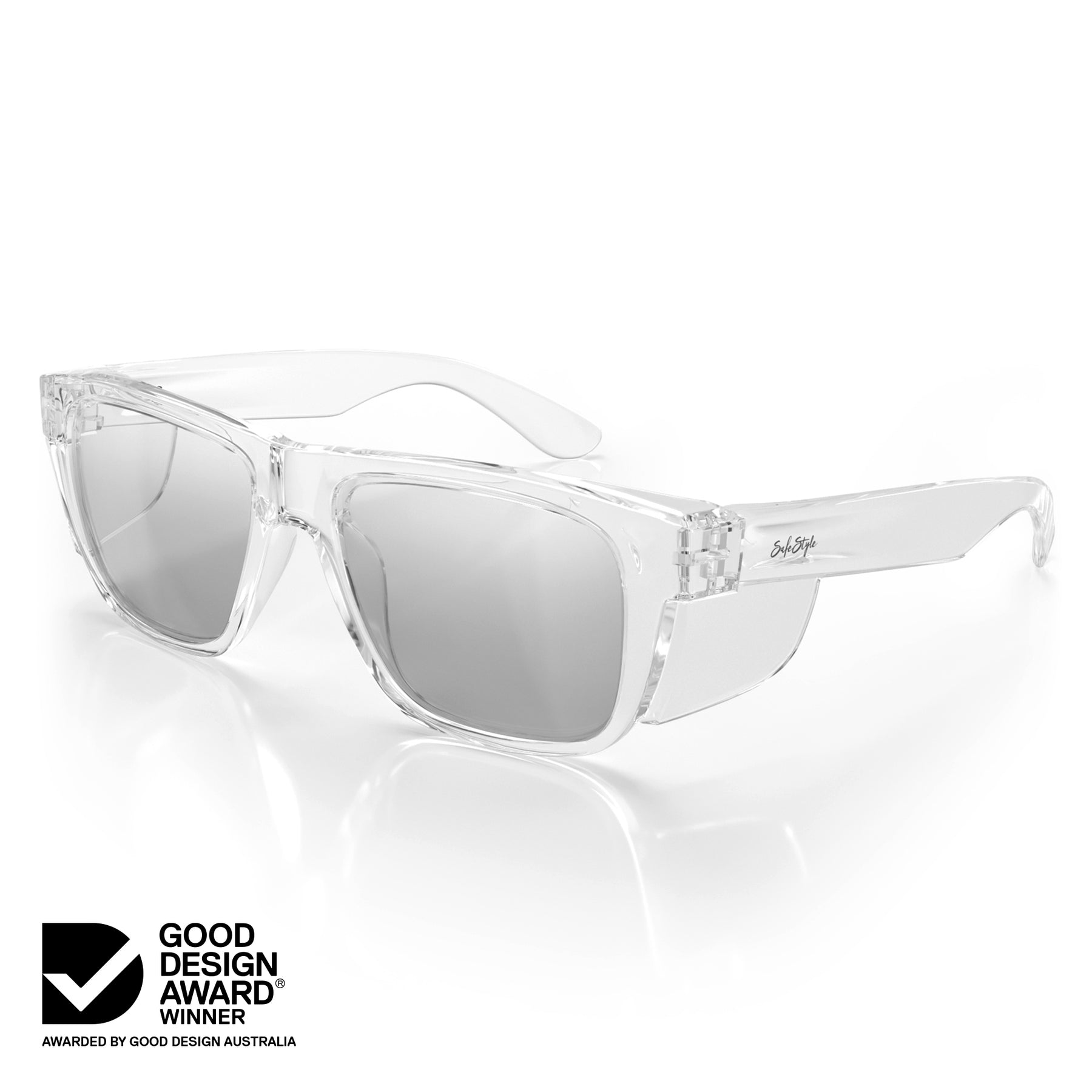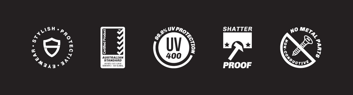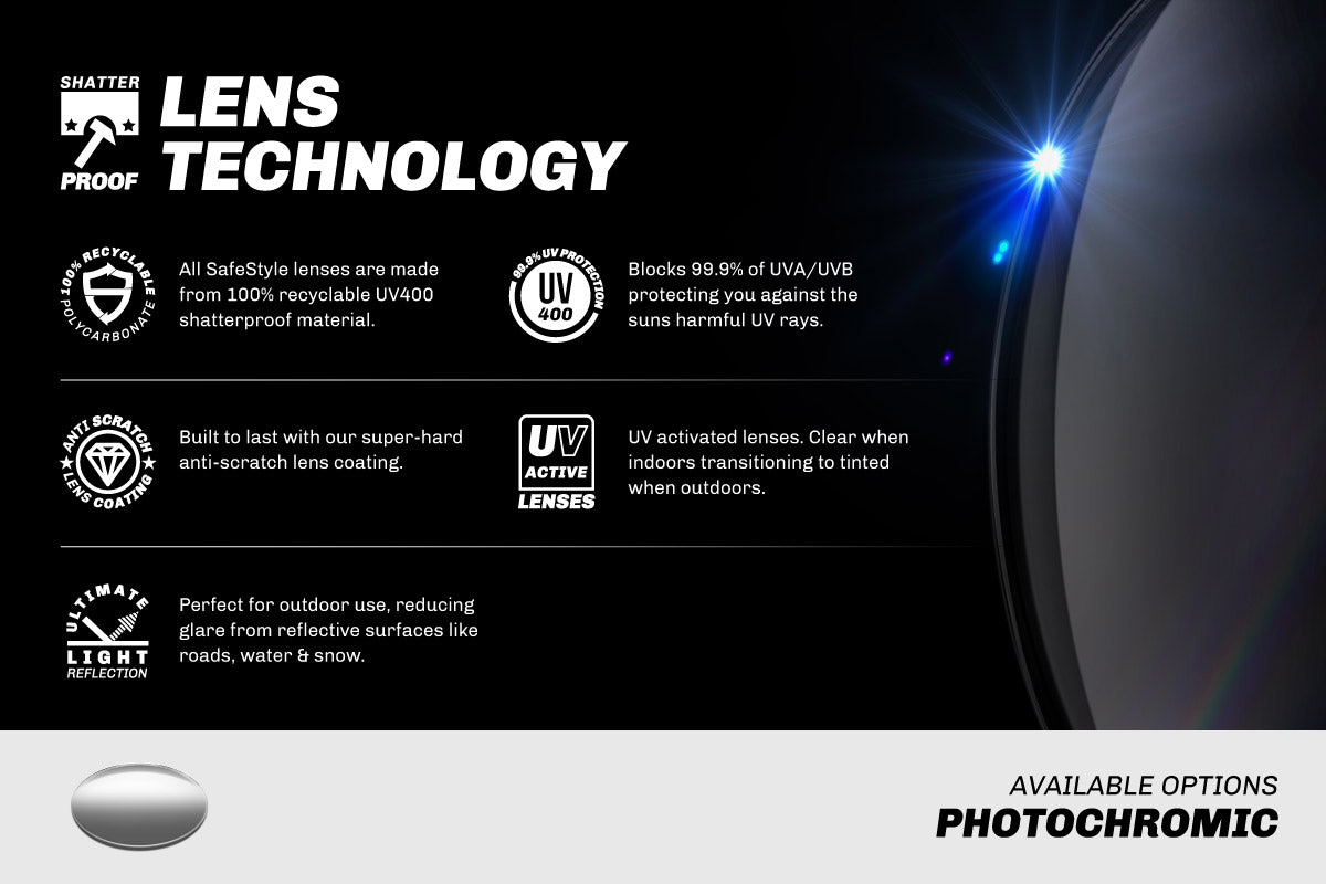 All SafeStyle lenses are made from 100% recyclable UV400 shatterproof polycarbonate, blocking 99.9% of UVA/UVB with a super-hard anti-scratch coating.